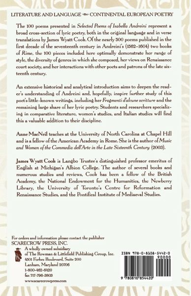 Selected Poems of Isabella Andreini comprises an extensive historical and analytical introduction, followed by 100 poems given in their original Italian, with facing-page verse translations. It will be a welcome addition to classroom literature in comparative literatures, women's studies, and Italian studies. It is the first modern publication of a significant body of Andreini's poems in English translation.