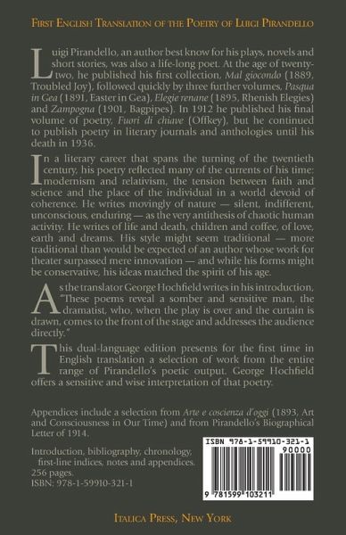 Luigi Pirandello, an author best know for his plays, novels and short stories, was also a life-long poet. At the age of twenty-two, he published his first collection, "Mal giocondo" (1889, Troubled Joy), followed quickly by three further volumes, "Pasqua in Gea" (1891, Easter in Gea), "Elegie renane" (1895, Rhenish Elegies) and "Zampogna" (1901, Bagpipes). In 1912 he published his final volume of poetry, "Fuori di chiave" (Offkey), but he continued to publish poetry in literary journals and anthologies until his death in 1936. In a literary career that spans the turning of the twentieth century, his poetry reflected many of the currents of his time: modernism and relativism, the tension between faith and science and the place of the individual in a world devoid of coherence. He writes movingly of nature - silent, indifferent, unconscious, enduring - as the very antithesis of chaotic human activity. He writes of life and death, children and coffee, of love, earth and dreams. His style might seem traditional - more traditional than would be expected of an author whose work for theater surpassed mere innovation - and while his forms might be conservative, his ideas matched the spirit of his age. As the translator George Hochfield writes in his introduction, "These poems reveal a somber and sensitive man, the dramatist, who, when the play is over and the curtain is drawn, comes to the front of the stage and addresses the audience directly." This dual-language edition presents for the first time in English translation a selection of work from the entire range of Pirandello's poetic output. George Hochfield offers a sensitive and wise interpretation of that poetry. Appendices include a selection from "Arte e coscienza d'oggi" (1893, Art and Consciousness in Our Time) and from Pirandello's Biographical Letter of 1914. Dual-language Poetry Introduction, bibliography, chronology, first-line indices, notes and appendices. 256 pages.