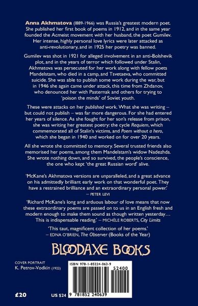 This comprehensive edition of Russia's greatest modern poet, Anna Akhmatova (1899-1966), includes the complete texts of her major works Requiem, commemorating all of Stalin's victims, and Poem Without a Hero.