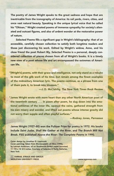 The first selected poems of a major poet who "wrote with more heart than any other North American poet of the twentieth century" (Rodney Jones, Parnassus) More than any other poet of his generation, James Wright spoke to the great sadness and hope that are inextricable from the iconography of America: its rail yards, rivers, cities, and once vast natural beauty. Speaking in the unique lyrical voice that he called his "Ohioan," Wright created poems of immense sympathy for sociey's alienated and outcast figures and also of ardent wonder at the restorative power of nature. Selected Poems fills a significant gap in Wright's bibliography: that of an accessible, carefully chosen collection to satisfy both longtime readers and those just discovering his work. Edited and with an introduction by Wright's widow, Anne, and his close friend the poet Robert Bly, who also wrote an introduction, Selected Poems is a personal, deeply considered collection of work with pieces chosen from all of Wright's books. It is an overdue--and timely--new view of a poet whose life and work encompassed the extremes of American life.