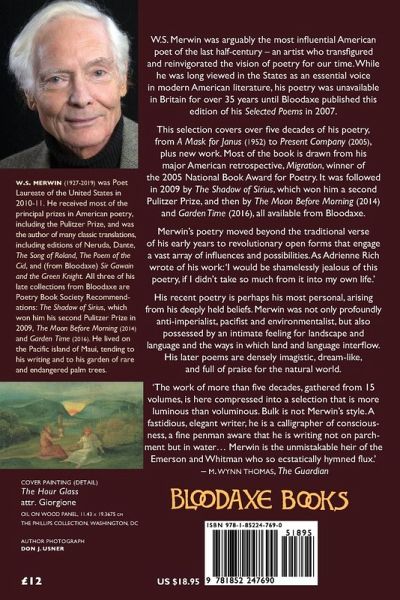 W.S. Merwin was arguably the most influential American poet of the last half-century. While he was long viewed in the States as an essential voice in modern American literature, his poetry was unavailable in Britain for over 35 years until Bloodaxe published this edition of his Selected Poems in 2007.