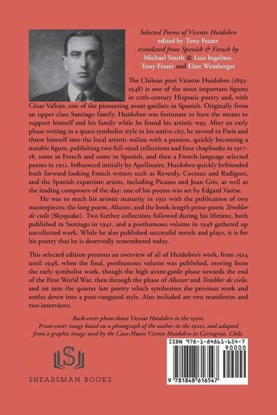 The Chilean poet Vicente Huidobro (1893-1948) is one of the most important figures in 20th-century Hispanic poetry and, with César Vallejo, one of the pioneering avant-gardists in Spanish. Originally from an upper-class Santiago family, Huidobro was fortunate to have the means to support himself and his family while he found his artistic way. After an early phase writing in a quasi-symbolist style in his native city, he moved to Paris and threw himself into the local artistic milieu with a passion, quickly becoming a notable figure, publishing a large number of books in the period 1917-1925. Influenced initially by Apollinaire, Huidobro quickly befriended both forward-looking French writers such as Reverdy, Cocteau and Radiguet, and the Spanish expatriate artists, including Picasso and Juan Gris.He reached his poetic maturity in 1931 with the publication of two master-pieces: the long poem, Altazor, and the book-length prose-poem Temblor de cielo (Skyquake). Two further collections would follow during his lifetime, both published in Santiago in 1941. While he also published successful novels and plays, it is for his poetry that he is best remembered today.