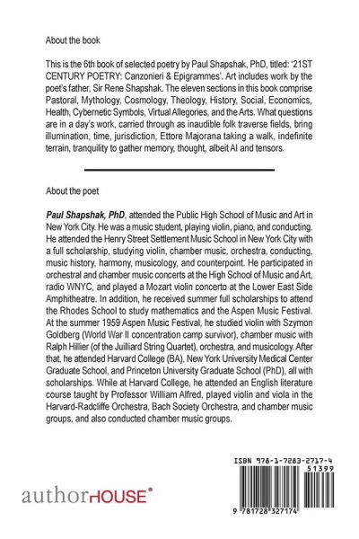 This is the 6th book of selected poetry by Paul Shapshak, PhD, titled: '21ST CENTURY POETRY: Canzonieri & Epigrammes'. Art includes work by the poet's father, Sir Rene Shapshak. The eleven sections in this book comprise Pastoral, Mythology, Cosmology, Theology, History, Social, Economics, Health, Cybernetic Symbols, Virtual Allegories, and the Arts. What questions are in a day's work, carried through as inaudible folk traverse fields, bring illumination, time, jurisdiction, Ettore Majorana taking a walk, indefinite terrain, tranquility to gather memory, thought, albeit AI and tensors.