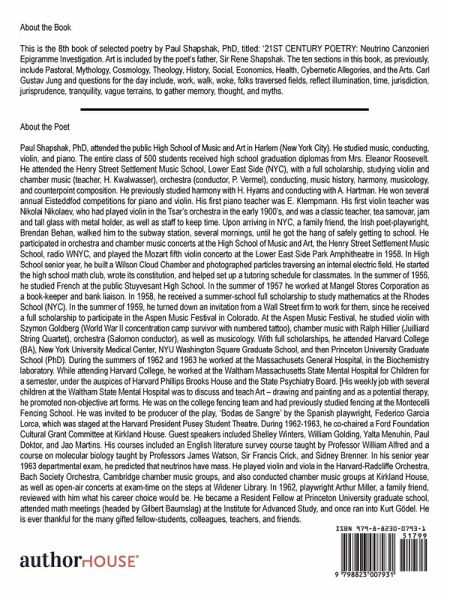 This is the 8th book of selected poetry by Paul Shapshak, PhD, titled: '21ST CENTURY POETRY: Neutrino Canzonieri Epigramme Investigation. Art is included by the poet's father, Sir Rene Shapshak. The ten sections in this book, as previously, include Pastoral, Mythology, Cosmology, Theology, History, Social, Economics, Health, Cybernetic Allegories, and the Arts. Carl Gustav Jung and questions for the day include, work, walk, woke, folks traversed fields, reflect illumination, time, jurisdiction, jurisprudence, tranquility, vague terrains, to gather memory, thought, and myths.