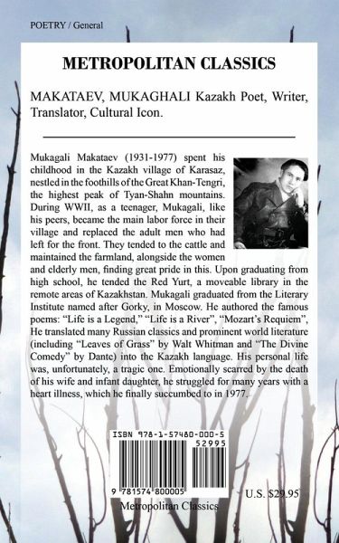 Embarking on the path of no return, Now I will not turn back, no - not even a glance. I write poems. All that I've longed to say, having said, I'll meet my end, Even if I'm to stand, the gallows facing Mukaghali, 1972 Mukaghali Makataev (1931-1977) spent his childhood in the Kazakh village of Karasaz, nestled in the foothills of the Great Khan-Tengri, the highest peak of Tyan-Shahn mountains. During WWII, as a teenager, Mukaghali, like his peers, became the main labor force in their village and replaced the adult men who had left for the front. They tended to the cattle and maintained the farmland, alongside the women and elderly men, finding great pride in this. Upon graduating from high school, he tended the Red Yurt, a moveable library in the remote areas of Kazakhstan. .Mukaghali graduated from the Literary Institute named after Gorky, in Moscow. He authored the famous poems: "Life is a Legend," "Life is a River", "Mozart's Requiem", He translated many Russian classics and prominent world literature (including "Leaves of Grass" by Walt Whitman and "The Divine Comedy" by Dante) into the Kazakh language. His personal life was, unfortunately, a tragic one. Emotionally scarred by the death of his wife and infant daughter, he struggled for many years with a heart illness, which he finally succumbed to in 1977. The book @Selected Poetry of Mukaghali", by the outstanding Kazakh writer Mukaghali Makataev is the first book of a collection of books of classic Kazakh writers in English, which the Kazakh PEN-club has decided to publish in the USA. The book collection - " We are Kazakhs" is being published under the supervision of the President of the Kazakh PEN-club Mr. BIGELDY GABDULLIN