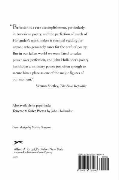 "Perfection is a rare accomplishment, particularly in American poetry, and the perfection of much of Hollander's work makes it essential reading for anyone who genuinely cares for the craft of poetry. But in our fallen world we seem fated to value power of perfection, and John Hollander's poetry has shown a visionary power just often enough to secure him a place as one of the major figures of our moment." Vernon Shetley, The New Republic