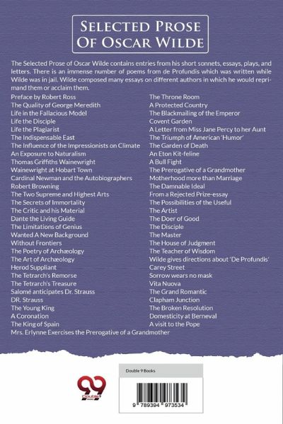 The Selected Prose of Oscar Wilde contains entries from his short sonnets, essays, plays, and letters. There is an immense number of poems from de Profundis which was written while Wilde was in jail. Wilde composed many essays on different authors in which he would reprimand them or acclaim them. Contents:Preface by Robert Ross The Quality of George Meredith Life in the Fallacious Model Life the Disciple Life the Plagiarist The Indispensable East The Influence of the Impressionists on Climate An Exposure to Naturalism Thomas Griffiths Wainewright Wainewright at Hobart Town Cardinal Newman and the Autobiographers Robert Browning ...