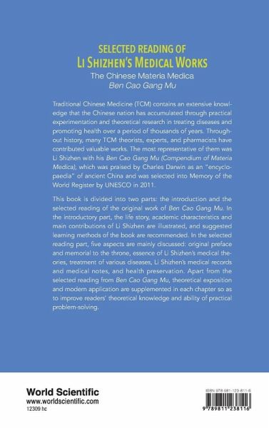 Traditional Chinese Medicine (TCM) contains an extensive knowledge that the Chinese nation has accumulated through practical experimentation and theoretical research in treating diseases and promoting health over a period of thousands of years. Throughout the history, many TCM theorists, experts, and pharmacists have contributed valuable works. The most representative of them was Li Shizhen with his Ben Cao Gang Mu (Compendium of Materia Medica), which was praised by Charles Darwin as an "encyclopaedia" of ancient China and was selected into Memory of the World Register by UNESCO in 2011. This book is divided into two parts: the introduction and the selected reading of the original work of Ben Cao Gang Mu. In the introductory part, the life story, academic characteristics and main contributions of Li Shizhen are illustrated, and suggested learning methods of the book are recommended. In the selected reading part, five aspects are mainly discussed: original preface and memorial to the throne, essence of Li Shizhen's medical theories, treatment of various diseases, Li Shizhen's medical records and medical notes, and health preservation. Apart from the selected reading from Ben Cao Gang Mu, theoretical exposition and modern application are supplemented in each chapter so as to improve readers' theoretical knowledge and ability of practical problem-solving.