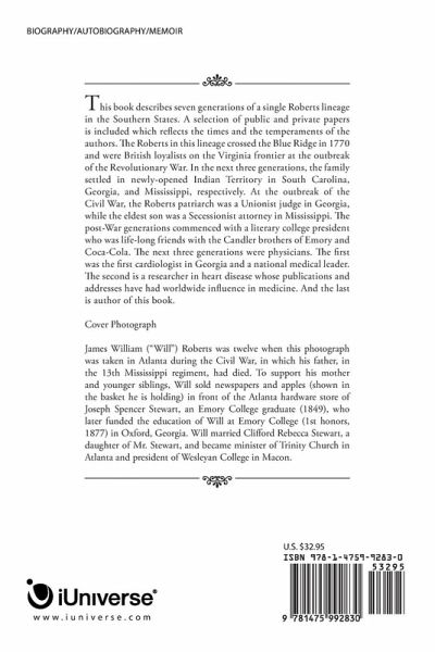 This book describes seven generations of a single Roberts lineage in the Southern States. A selection of public and private papers is included which refl ects the times and the temperaments of the authors. The Roberts in this lineage crossed the Blue Ridge in 1770 and were British loyalists on the Virginia frontier at the outbreak of the Revolutionary War. In the next three generations, the family settled in newly-opened Indian Territory in South Carolina, Georgia, and Mississippi,respectively. At the outbreak of the Civil War, the Roberts patriarch was a Unionist judge in Georgia, while the eldest son was a Secessionist attorney in Mississippi. The post War generations commenced with a literary college president who was life-long friends with the Candler brothers of Emory and Coca Cola. The next three generations were physicians. The first was the fi rst cardiologist in Georgia and a national medical leader. The second is a researcher in heart disease whose publications and addresses have had worldwide influence in medicine. And the last is author of this book. Cover Photograph James William ("Will") Roberts was twelve when this photograph was taken in Atlanta during the Civil War, in which his father, in the 13th Mississippi regiment, had died. To support his mother and younger siblings, Will sold newspapers and apples (shown in the basket he is holding) in front of the Atlanta hardware store of Joseph Spencer Stewart, an Emory College graduate (1849), who later funded the education of Will at Emory College (1st honors,1877) in Oxford, Georgia. Will married Cliff ord Rebecca Stewart, a daughter of Mr. Stewart, and became minister of Trinity Church in Atlanta and president of Wesleyan College in Macon.