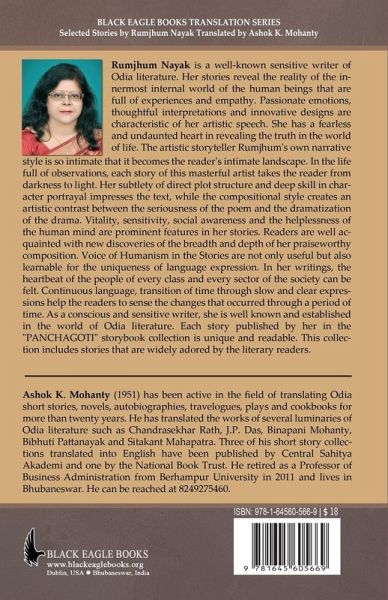 Rumjhum Nayak is a well-known sensitive writer of Odia literature. Her stories reveal the reality of the innermost internal world of the human beings that are full of experiences and empathy. Passionate emotions, thoughtful interpretations and innovative designs are characteristic of her artistic speech. She has a fearless and undaunted heart in revealing the truth in the world of life. The artistic storyteller Rumjhum's own narrative style is so intimate that it becomes the reader's intimate landscape. In the life full of observations, each story of this masterful artist takes the reader from darkness to light. Her subtlety of direct plot structure and deep skill in character portrayal impresses the text, while the compositional style creates an artistic contrast between the seriousness of the poem and the dramatization of the drama. Vitality, sensitivity, social awareness and the helplessness of the human mind are prominent features in her stories. Readers are well acquainted with new discoveries of the breadth and depth of her praiseworthy composition. Voice of Humanism in the Stories are not only useful but also learnable for the uniqueness of language expression. In her writings, the heartbeat of the people of every class and every sector of the society can be felt. Continuous language, transition of time through slow and clear expressions helps the readers to sense the changes that occurred through a period of time. As a conscious and sensitive writer, she is well known and established in the world of Odia literature. Each story published by her in the "PANCHAGOTI" storybook collection is unique and readable. This collection includes stories that are widely adored by the literary readers.