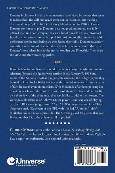 Durante is old now. His face is permanently subdivided by ravines that seem to radiate from the well publicized extension in its center. But the skills that first drew people to him in a Coney Island saloon in 1910 still work. Durante continues to play Durante, a warm, good, oppressed, not fully lettered man in whom everyone can see a bit of himself. He is a throwback. In a day when entertainment is a prefabricated commodity and we are told performers are the stars before we even know their skills, Durante raucously reminds us of a time when entertainers were fun, genuine, alive. More than Durante's nose relates him to the storied wooden boy Pinocchio. They share the same impish, wondering quality. If you believe in numbers, he should have been a lawyer, maybe an insurance salesman. Because the figures were terrible. It was January 7, 1968 and teams of the National Football League were choosing the college players they wanted to hire. Rocky Bleier was not at the head of anyone's list. As a matter of fact, he wasn't even on most lists. With thousands of athletes pouring out of colleges each year, the pros need some orderly way to rate and eventually pick those few, of the thousands, they would like to add to their rosters. The worst possible rating is 2.5. Above 1.8 the player "is not capable of playing pro ball." Bleier was judged from 2.2 to 2.4. Wait, it gets worse. One Bleier observer noted, "Can't win in the NFL with this kid." Another, "I don't think this boy can make a pro club". The Steelers picked 18 players that year. Bleier, number 18, is the only one still in pro ball.