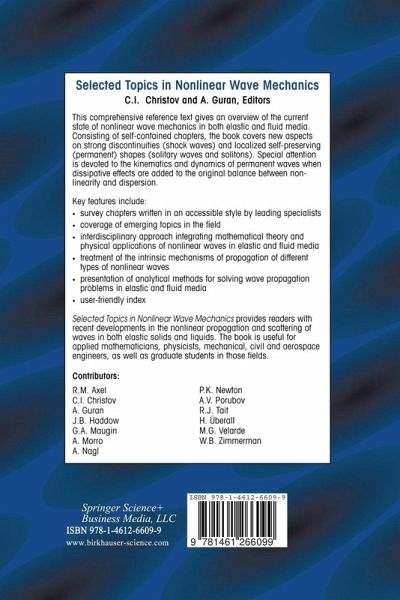 1 Elastic Surface Waves, Resonances, and Inverse Acoustic Scattering.- 1.1 Introduction.- 1.2 Waves on elastic plates: Lamb-type and Scholte-Stoneley waves.- 1.3 Acoustic Interactions Wich Ocean-Floor Sediments.- 1.4 Conclusions.- 2 Amplitude Equation Models for the Interaction of Shocks with Nonlinear Dispersive Wave Envelopes.- 2.1 Introduction.- 2.2 The Weak Coupling Limit.- 2.3 The Riemann Problem.- 2.4 The Zero Diffusion Limit.- 2.5 Dynamics Prior to Shock Onset.- 2.6 The Incompressible Limit.- 2.7 Exact Solutions.- 2.8 The ? = 0 Problem.- 2.9 The Multi-Scale Expansions.- 2.10 Modulation Equations for the Dispersive Wave.- 2.11 Analysis of the Effective Shock Equation for the Nonlinear Limit.- 2.12 Analysis of the Effective Shock Equation in the Linear Limit.- 2.13 Numerical Experiments.- 3 Some Aspects of One-Dimensional Finite Amplitude Elastic Wave Propagation.- 3.1 First Order Equations.- 3.2 Systems of First Order Equations.- 3.3 Elastic Strings.- 3.4 Problems for membranes.- 3.5 Some problems for three dimensional elastic bodies.- 3.6 Thermodynamic considerations.- 4 Nonlinear Duality Between Elastic Waves and Quasi-particles.- 4.1 Introduction.- 4.2 Hyperbolicity and Conservation Laws.- 4.3 Elasticity as a field theory.- 4.4 Solitonic systems.- 4.5 Nearly integrable systems.- 4.6 Examples from Continuum Mechanics.- 4.7 Conclusions.- 5 Time-Harmonic Waves in Pre-Stressed Dissipative Materials.- 5.1 Introduction.- 5.2 Linearized Equations in Solids.- 5.3 Constitutive Equation for Solids.- 5.4 Linearized Equations and Restrictions for Fluids.- 5.5 Propagation Condition for Inhomogeneous Waves.- 5.6 Dissipation and Wave Decay.- 5.7 A New Approach to Wave Propagation.- 5.8 Rays in Pre-Stressed Solids.- 6 Dissipative Effects on the Evolution of Internal SolitaryWaves in a t Sheared, Stably Stratified Fluid Layer.- 6.1 Introduction.- 6.2 Model system.- 6.3 Discussion.- 6.4 Conclusions.- 7 Dissipative Nonlinear Strain Waves in Solids.- 7.1 Introduction.- 7.2 Modelling of nonlinear waves in an elastic rod.- 7.3 Mathematical tools for analysis of the governing equations.- 7.4 Amplification of a strain solitary wave in a narrowing rod.- 7.5 Selection of nonlinear strain waves in an elastic rod due to the influence of an external medium.- 7.6 Influence of macro- and micro-dissipation on the formation of dissipative solitary waves.- 7.7 Concluding remarks.