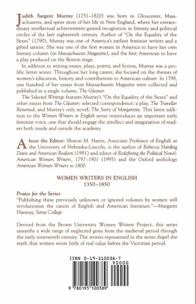 As a novelist, essayist, dramatist, and poet, Judith Sargent Murray candidly and often humorously asserted her opinions about the social and political conditions of women in late eighteenth-century America. As a committed feminist, she urged American women to enter a "new era in female history", yet published her own writings under a man's name in the hopes of more widely disseminating her ideas. This volume includes selections from The Gleaner, her major work, and other publications.