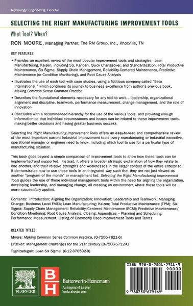 Selecting the Right Manufacturing Improvement Tools offers an easy-to-read and comprehensive review of the most important current industrial improvement tools that every manufacturing or industrial executive, operational manager or engineer needs to know, including which tool to use for a particular type of manufacturing situation. But his book goes beyond a simple comparison of improvement tools to show how these tools can be implemented and supported. Instead, it offers a broader strategic explanation of how they relate to one another, and their relative strengths and weaknesses in the larger context of the entire enterprise. It demonstrates how to use these tools in an integrated way such that they are not just be viewed as another "program of the month? or management fad. Selecting the Right Manufacturing Improvement Tools guides the use of these individual management tools within the need for aligning the organization, developing leadership, and managing change, all for creating an environment where these tools will be more successfully applied.