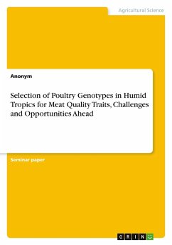 Seminar paper from the year 2018 in the subject Agrarian Studies, grade: 1, Hawassa University, course: Animal Breeding, language: English, abstract: The objective of this paper is to review selection of poultry genotypes in humid tropics for meat quality traits, the challenges, and opportunities including selection of poultry genotypes, breeds of broilers kept by the farmers, selection criteria, and trait preference for meat quality in humid tropics.The indigenous village chicken is the most prominent class of livestock in the country and constitutes about 60-80% of the total poultry population, their productivity levels are low because of low genetic potential and poor nutrition. To overcome the problem of low productivity in local chickens, high-yielding exotic breeds have been introduced through cockerel exchange program by the government. This intervention is bedeviled with many challenges; prominent among them is the birds' inability to adapt to the humid and hot environment, resulting in reduced feed intake and retarded growth. A number of major heat-tolerant genes or gene complexes like naked-neck, ptylopody, polydactyly and frizzle have been identified in the genome of Ghanaian local chicken populations. These unique genes have been reported to ameliorate tropical heat stress and enhance the performance of chickens under hot and humid environments. The existence of the naked-neck gene results in 20-30% less feather coverage overall, with the lower neck of the bird appearing almost naked while the frizzle gene but is reported to reduce the insulating properties of the feather cover (reduce featherweight) and make it easier for the bird to radiate heat from the body.