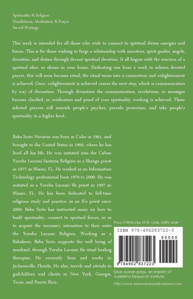 This work is intended for all those that wish to connect to spiritual divine energies, and forces. This is for those wishing to forge a relationship with ancestor, spirit guides, angels, divinities, and deities through devout spiritual devotion. It all begins with the erection of a spiritual alter, or shrine in your home. Dedicating one hour a week to solemn devoted prayer, this will soon become ritual, the ritual turns into a connection; and enlightenment is achieved. Once, enlightenment is achieved comes the next step, which is communication by way of divination. Through divination the communication, revelations, or messages become clarified, so verification and proof of your spirituality working is achieved. These selected prayers will nourish people's psyches, provide protection, and take people's spirituality to a higher level. Born in Cuba in 1961, and brought to the United States in 1966, where has lived all his life. Initiated into the Cuban Yoruba Lucumi Santeria Religion as a Shango priest in 1977 - Miami, FL. Worked as an Information Technology professional from 1979 to 2000. Initiated as a Yoruba Lucumi Ifa priest in 1997 - Miami, FL. Dedicated to full-time religious study and practice, as an IFa priest since 2000. Baba Sixto has instructed many on how to build spirituality, connect to spiritual forces, so as to acquire the necessary intonation to then enter the Yoruba Lucumi Religion. Working as a Babalawo, Baba Sixto supports the well being of mankind, through Yoruba Lucumi Ifa ritual healing therapies. Currently, live and work in Jacksonville, Florida. Also, travels and attend godchildren and clients in New York, Georgia, Texas, and Puerto Rico.
