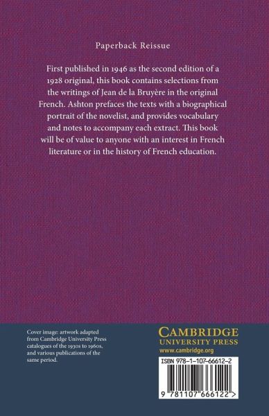 First published in 1946 as the second edition of a 1928 original, this book contains selections from the writings of Jean de la Bruyère in the original French. Ashton prefaces the texts with a biographical portrait of the novelist, and provides vocabulary and notes to accompany each extract. This book will be of value to anyone with an interest in French literature or in the history of French education.