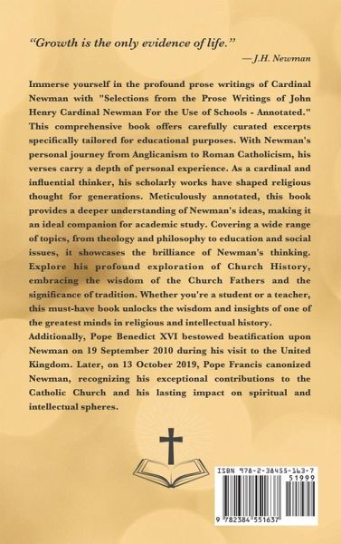 "Growth is the only evidence of life."- J.H. Newman Immerse yourself in the profound prose writings of Cardinal Newman with "Selections from the Prose Writings of John Henry Cardinal Newman For the Use of Schools - Annotated." This comprehensive book offers carefully curated excerpts specifically tailored for educational purposes. With Newman's personal journey from Anglicanism to Roman Catholicism, his verses carry a depth of personal experience. As a cardinal and influential thinker, his scholarly works have shaped religious thought for generations. Meticulously annotated, this book provides a deeper understanding of Newman's ideas, making it an ideal companion for academic study. Covering a wide range of topics, from theology and philosophy to education and social issues, it showcases the brilliance of Newman's thinking. Explore his profound exploration of Church History, embracing the wisdom of the Church Fathers and the significance of tradition. Whether you're a student or a teacher, this must-have book unlocks the wisdom and insights of one of the greatest minds in religious and intellectual history. Additionally, Pope Benedict XVI bestowed beatification upon Newman on 19 September 2010 during his visit to the United Kingdom. Later, on 13 October 2019, Pope Francis canonized Newman, recognizing his exceptional contributions to the Catholic Church and his lasting impact on spiritual and intellectual spheres. Table of Contents: INTRODUCTION APPRECIATIONS Part I. CHARACTER SKETCHES Saul Early Years Of DavidBasil And Gregory Augustine And The Vandals Chrysostom Part II. THE TURK The Tartar and the TurkThe Turk and the SaracenThe Past and Present of the Ottomans Part III. UNIVERSITIES What is a University? University Life: Athens Supply and Demand: The Schoolmen The Strength and Weakness of Universities: Abelard Part IV. MISCELLANEOUS Poetry, with Reference to Aristotle's Poetics The Infinitude of the Divine Attributes Christ upon the Waters The Second Spring St. Paul's Characteristic Gift Appreciations: In Newman's sketch of the influence of Abelard on his disciples is seen his belief in the immense power for good or ill of a dominating personality. And he himself supplied an object-lesson in his theory. Shairp, Froude, Church, Wilberforce, Gladstone, are only a few of those who have borne testimony to the personal magnetism which left its mark on the whole of thinking Oxford. "Cor ad cor loquitur," the motto chosen by Newman on his receiving the Cardinal's hat, expressed to him the whole reality of intercourse between man and man, and man and God.-Wilfrid Ward's Problems and Persons.