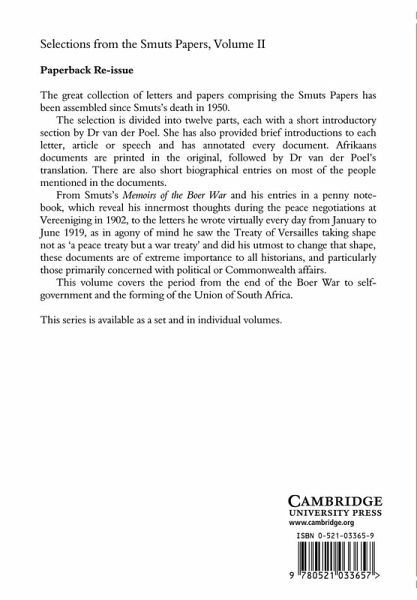The great collection of letters and papers comprising the Smuts Papers has been assembled at the University of Cape Town by Dr Jean van der Poel, under Sir Keith Hancock's direction, since Smuts's death in 1950. The first four volumes of selections cover the period 1886(?)1;1919. The selections are divided into twelve parts, each with a short introductory section. Dr van der Poel has provided brief introductions to each letter, article or speech and has annotated every document. This volume covers the period from the end of the Boer War to self-government and the forming of the Union of South Africa.
