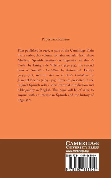 First published in 1926, as part of the Cambridge Plain Texts series, this volume contains material from three medieval Spanish treatises on linguistics: El arte de trobar by Enrique de Villena (1384-1434); the second book of Gramática castellana by Antonio de Lebrija (1444-1522); and the Arte de la poesía castellana by Juan del Encina (1469-1529). Texts are presented in the original Spanish with a short editorial introduction and bibliography in English. This book will be of value to anyone with an interest in Spanish and the history of linguistics.