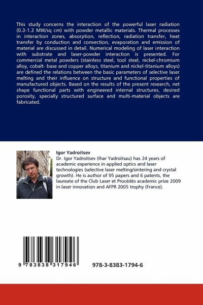 This study concerns the interaction of the powerful laser radiation (0.3-1.3 MW/sq cm) with powder metallic materials. Thermal processes in interaction zones, absorption, reflection, radiation transfer, heat transfer by conduction and convection, evaporation and emission of material are discussed in detail. Numerical modeling of laser interaction with substrate and laser-powder interaction is presented. For commercial metal powders (stainless steel, tool steel, nickel-chromium alloy, cobalt- base and copper alloys, titanium and nickel-titanium alloys) are defined the relations between the basic parameters of selective laser melting and their influence on structure and functional properties of manufactured objects. Based on the results of the present research, net shape functional parts with engineered internal structures, desired porosity, specially structured surface and multi-material objects are fabricated.