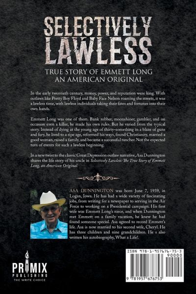 In the early twentieth century, money, power, and reputation were king. With outlaws like Pretty Boy Floyd and Baby Face Nelson roaming the streets, it was a lawless time, with lawless individuals taking their fates and fortunes into their own hands. Emmett Long was one of them. Bank robber, moonshiner, gambler, and on occasion even a killer, he made his own rules. But he varied from the typical story. Instead of dying at the young age of thirty-something in a blaze of guns and fury, he lived to a ripe age, reformed his ways, found Christianity, married a good woman, raised a family, and became a successful rancher. Not the expected turn of events for such a lawless beginning. In a new twist to the classic Great Depression outlaw narrative, Asa Dunnington shares the life story of his uncle in Selectively Lawless: The True Story of Emmett Long, an American Original.