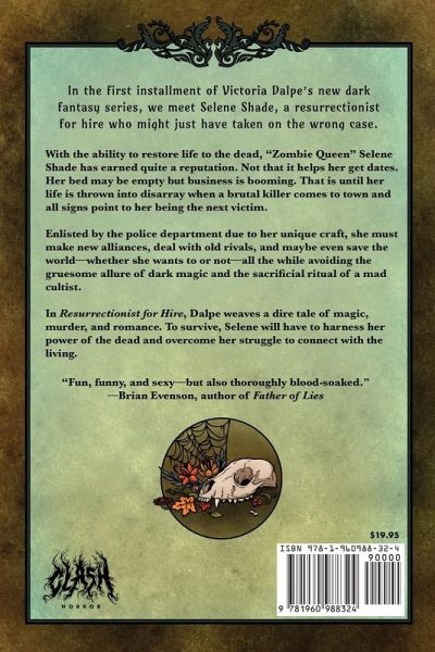 In the first installment of Victoria Dalpe's new dark fantasy series, we meet Selene Shade, a resurrectionist for hire who might just have taken on the wrong case. With the ability to restore life to the dead, "Zombie Queen" Selene Shade has earned quite a reputation. Not that it helps her get dates. Her bed may be empty but business is booming. That is until her life is thrown into disarray when a brutal killer comes to town and all signs point to her being the next victim. Enlisted by the police department due to her unique craft, she must make new alliances, deal with old rivals, and maybe even save the world-whether she wants to or not—all the while avoiding the gruesome allure of dark magic and the sacrificial ritual of a mad cultist. In Resurrectionist for Hire, Dalpe weaves a dire tale of magic, murder, and romance. To survive, Selene will have to harness her power of the dead and overcome her struggle to connect with the living.