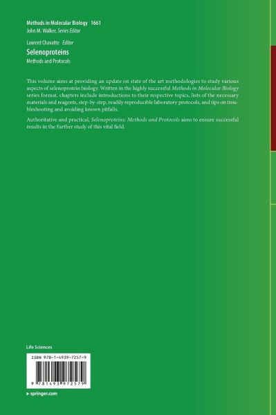 SECISearch3 and Seblastian: In Silico Tools to Predict SECIS Elements and Selenoproteins.- Selenoprofiles: A Computational Pipeline for Annotation of Selenoproteins.- SelGenAmic: An Algorithm for Selenoprotein Gene Assembly.- Selenocysteine tRNA[Ser]Sec, the Central Component of Selenoprotein Biosynthesis: Isolation, Identification, Modification and Sequencing.- Identification and Characterization of Proteins that Bind to Selenoprotein 3' UTRs.- Specific Chemical Approaches for Studying Mammalian Ribosomes Complexed with Ligands Involved in Selenoprotein Synthesis.- Studying Selenoprotein mRNA Translation using RNA-Seq and Ribosome Profiling.- Modification of Selenoprotein mRNAs by Cap Tri-methylation.- Total Selenium Quantification in Biological Samples by Inductively Coupled Plasma Mass Spectrometry (ICP-MS).- Quantification of SeMet and SeCys in Biological Fluids and Tissues by Liquid Chromatography Coupled to Inductively Coupled Plasma Mass Spectrometry (HPLC - ICP MS).-Simultaneous Speciation of Selenoproteins and Selenometabolites in Plasma and Serum.- Radioactive 75Se Labeling and Detection of Selenoproteins.- Non-radioactive Isotopic Labeling and Tracing of Selenoproteins in Cultured Cell Lines.- Detection of Selenoproteins by Laser Ablation Inductively Coupled Plasma Mass Spectrometry (LA-ICP MS) in Immobilized pH Gradient (IPG) Strips.- Imaging of Selenium by Laser Ablation Inductively Coupled Plasma Mass Spectrometry (LA-ICP-MS) in 2-D Electrophoresis Gels and Biological Tissues.- Overexpression of Recombinant Selenoproteins in E. coli.- Preparation of Selenocysteine-containing Forms of Human SELENOK and SELENOS.- Selenocysteine Mediated Expressed Protein Ligation of SELENOM.- Monitoring of Methionine Sulfoxide Content and Methionine Sulfoxide Reductase Activity.- Selective Evaluation of Thioredoxin Reductase Enzymatic Activities.- Association of Single Nucleotide Polymorphisms in Selenoprotein Genes with Cancer Risk.- Identification of Genetic Disorders Causing Disruption of Selenoprotein Biosynthesis.