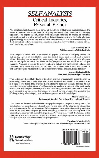 Mitchell Foreword. Part I: Development of the Capacity for Self-Analysis: Exploration of our "Personal Equations."Demos Developmental Foundations for the Capacity for Self-Analysis: Parallels in the Roles of Caregiver and Analyst. Bernardi Does Our Self-Analysis Take Into Consideration Our Assumptions? Part II: Analytic Work and Self-Analysis.Margulies Contemplating the Mirror of the Other: Empathy and Self-Analysis. McLaughlin Work with Patients and the Experience of Self-Analysis. Smith Engagements in Analysis and Their Use in Self-Analysis. Part III: Modes of Self-Analytic Activity.Wolf Self-Analysis of a Taboo. Gedo On Fastball Pitching Astronomical Clocks and Self-Cognition. Gardner On Talking to Ourselves: Some Self-Analytical Reflections on Self-Analysis. Part IV: The Role of the Other in Self-Analysis.Eifermann The Discovery of Real and Fantasized Audiences for Self-Analysis. Harris Ragen Mutual Supervision Countertransference and Self-Analysis. Poland Self and Other in Self-Analysis. Part V: Self-Analysis Writing and Creativity.Sonnenberg To Write or Not to Write: A Note on Self-Analysis and the Resistance to Self-Analysis. Anzieu Beckett: Self-Analysis and Creativity. Lussier Freud's Self-Analysis.