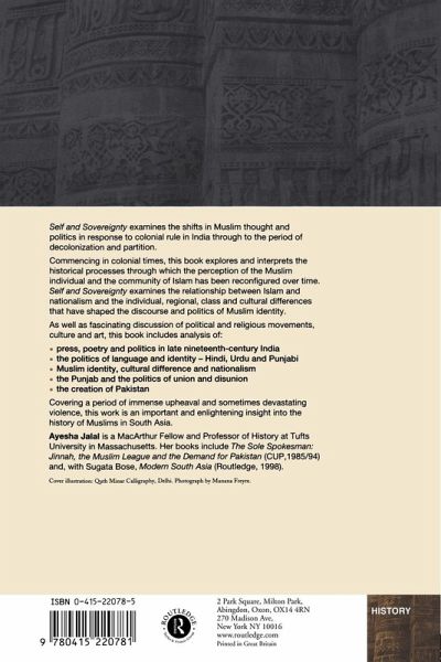 Self and Sovereignty surveys the role of individual Muslim men and women within India and Pakistan from 1850 through to decolonisation and the partition period. Commencing in colonial times, this book explores and interprets the historical processes through which the perception of the Muslim individual and the community of Islam has been reconfigured over time. Self and Sovereignty examines the relationship between Islam and nationalism and the individual, regional, class and cultural differences that have shaped the discourse and politics of Muslim identity. As well as fascinating discussion of political and religious movements, culture and art, this book includes analysis of: * press, poetry and politics in late nineteenth century India * the politics of language and identity - Hindi, Urdu and Punjabi * Muslim identity, cultural differnce and nationalism * the Punjab and the politics of Union and Disunion * the creation of Pakistan Covering a period of immense upheaval and sometimes devastating violence, this work is an important and enlightening insight into the history of Muslims in South Asia.