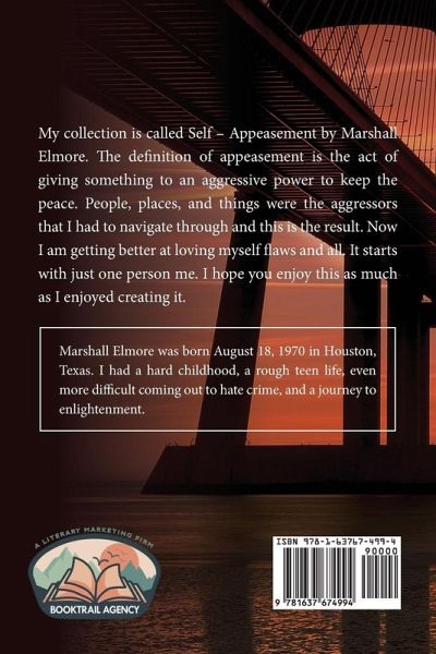 My collection is called Self - Appeasement by Marshall Elmore. The definition of appeasement is the act of giving something to an aggressive power to keep the peace. People, places, and things were the aggressors that I had to navigate through and this is the result. Now I am getting better at loving myself flaws and all. It starts with just one person. I hope you enjoy this as much as I enjoyed creating it. ¿I was born August 18, 1970 in Houston, Texas. I had a hard childhood, a rough teen life, even more difficult coming out to hate crime, and a journey to enlightenment.