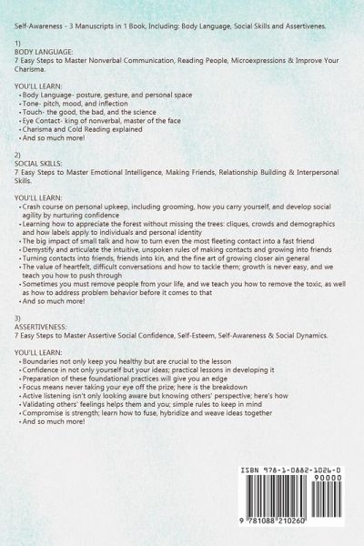 Self-Awareness - 3 Manuscripts in 1 Book, Including: Body Language, Social Skills and Assertivenes. 1) BODY LANGUAGE: 7 Easy Steps to Master Nonverbal Communication, Reading People, Microexpressions & Improve Your Charisma. YOU'LL LEARN: · Body Language- posture, gesture, and personal space · Tone- pitch, mood, and inflection · Touch- the good, the bad, and the science · Eye Contact- king of nonverbal, master of the face · Charisma and Cold Reading explainedAnd so much more! 2) SOCIAL SKILLS: 7 Easy Steps to Master Emotional Intelligence, Making Friends, Relationship Building & Interpersonal Skills. YOU'LL LEARN: · Crash course on personal upkeep, including grooming, how you carry yourself, and develop social agility by nurturing confidenceLearning how to appreciate the forest without missing the trees: cliques, crowds and demographics and how labels apply to individuals and personal identity The big impact of small talk and how to turn even the most fleeting contact into a fast friend Demystify and articulate the intuitive, unspoken rules of making contacts and growing into friends Turning contacts into friends, friends into kin, and the fine art of growing closer ain general The value of heartfelt, difficult conversations and how to tackle them; growth is never easy, and we teach you how to push through Sometimes you must remove people from your life, and we teach you how to remove the toxic, as well as how to address problem behavior before it comes to that And so much more! 3) ASSERTIVENESS: 7 Easy Steps to Master Assertive Social Confidence, Self-Esteem, Self-Awareness & Social Dynamics. YOU'LL LEARN:Boundaries not only keep you healthy but are crucial to the lesson Confidence in not only yourself but your ideas; practical lessons in developing it Preparation of these foundational practices will give you an edge Focus means never taking your eye off the prize; here is the breakdown Active listening isn't only looking aware but knowing others' perspective; here's how Validating others' feelings helps them and you; simple rules to keep in mind Compromise is strength; learn how to fuse, hybridize and weave ideas together And so much more!