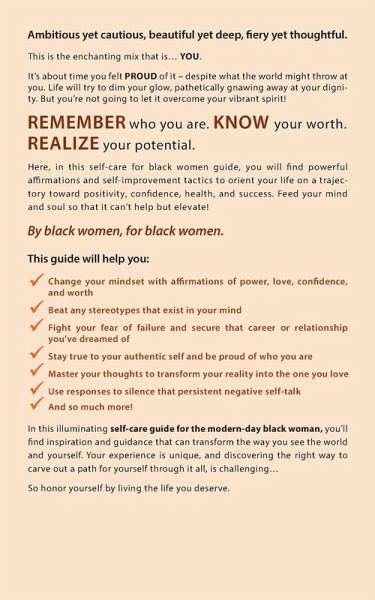 Ambitious yet cautious, beautiful yet deep, fiery yet reflective. This is the enchanting mix that is... YOU. It's about time you felt PROUD of it - despite what the world might throw at you. Life will try to dim your glow, pathetically gnawing away at your dignity. But you're not going to let it overcome your vibrant spirit! REMEMBER who you are. KNOW your worth. REALIZE your potential. Here, in this self-care for black women guide, you will find powerful declaration and self-improvement tactics to orient your life on a trajectory toward positivity, confidence, health, and success. Feed your mind and soul so that it can't help but raise! By black women, for black women. This guide will help you:Change your mindset with declaration of power, love, confidence, and worth Beat any stereotypes that exist in your mind Fight your fear of failure and secure that career or relationship you've dreamed of Stay true to your genuine self and be proud of who you are Master your thoughts to transform your reality into the one you love Use responses to silence that persistent negative self-talk And so much more! In this illuminating self-care guide for the modern-day black woman, you'll find inspiration and guidance that can transform the way you see the world and yourself. Your experience is unique, and discovering the right way to carve out a path for yourself through it all, is challenging...So honor yourself by living the life you deserve.