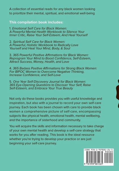 A collection of essential reads for any black women looking to prioritize their mental, spiritual, and emotional well-being This compilation book includes: 1. Emotional Self Care for Black Women: A Powerful Mental Health Workbook to Silence Your Inner Critic, Raise Your Self-Esteem, And Heal Yourself2. Spiritual Self Care for Black Women: A Powerful, Holistic Workbook to Radically Love Yourself and Heal Your Mind, Body, & Soul3. 365 Powerful Positive Affirmations for Black Women: Reprogram Your Mind to Boost Confidence, Self-Esteem, Attract Success, Money, Health, and Love4. 365 Badass Positive Affirmations for Strong Black Women: For BIPOC Women to Overcome Negative Thinking, Increase Confidence, and Self-Love 5. One Year Self-Discovery Journal for Black Women: 365 Eye-Opening Questions to Discover Your Self, Raise Self-Esteem, and Embrace Your True Beauty Not only do these books provides you with useful knowledge and inspiration, but also with a journal to record your own self-care journey. Each book has been chosen with care to provide black women a comprehensive picture of self-care, encompassing subjects like physical health, emotional health, mental wellbeing, and the importance of sisterhood and community.You will acquire the skills and information necessary to take charge of your own mental health and develop a self-care strategy that works for you after reading these books. This box set is the ideal resource whether you're trying to develop your practice or are just beginning your self-care journey. If you're ready to start, grab this book today.