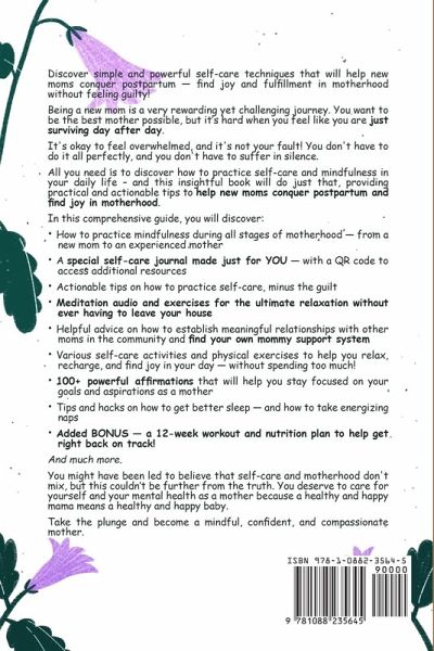 Discover simple and powerful self-care techniques that will help new moms conquer postpartum - find joy and fulfillment in motherhood without feeling guilty! Do you feel like you are losing yourself since you became a mom? Are you struggling to adjust to the demands of motherhood while trying to focus on your personal care and well-being? Perhaps you're feeling overwhelmed and exhausted but too scared to admit it. Or maybe you feel stuck in a cycle of guilt and fear, struggling to find the balance between being a mom and managing everything else in your life. Being a new mom is a very rewarding yet challenging journey. You want to be the best mother possible, but it's hard when you feel like you are just surviving day after day. Not to mention the changes you have to adjust to that come with being a mom. It's okay to feel overwhelmed, and it's not your fault! You don't have to do it all perfectly, and you don't have to suffer in silence. All you need is to discover how to practice self-care and mindfulness in your daily life - and this insightful book will do just that, providing practical and actionable tips to help new moms conquer postpartum and find joy in motherhood. In this comprehensive guide, you will discover:How to practice mindfulness during all stages of motherhood - from a new mom to an experienced mother A special self-care journal made just for YOU - with a QR code to access additional resources Actionable tips on how to practice self-care, minus the guilt Meditation audio and exercises for the ultimate relaxation without ever having to leave your house Helpful advice on how to establish meaningful relationships with other moms in the community and find your own mommy support system Various self-care activities and physical exercises to help you relax, recharge, and find joy in your day - without spending too much! 100+ powerful affirmations that will help you stay focused on your goals and aspirations as a mother Tips and hacks on how to get better sleep - and how to take energizing naps Added BONUS - a 12-week workout and nutrition plan to help get right back on track! And much more. You might have been led to believe that self-care and motherhood don't mix, but this couldn't be further from the truth. You deserve to care for yourself and your mental health as a mother because a healthy and happy mama means a healthy and happy baby. And that's exactly what this book is for - to help you become the best version of yourself as a person, woman, and mother.