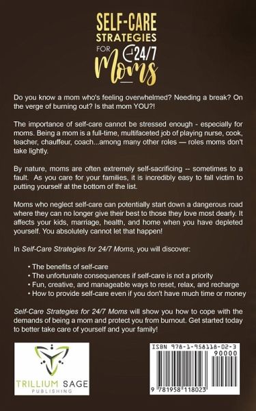 Do you know a mom who's feeling overwhelmed? Needing a break? On the verge of burning out? Is that mom YOU?! The importance of self-care cannot be stressed enough - especially for moms. Being a mom is a full-time, multifaceted job of playing nurse, cook, teacher, chauffeur, coach...among many other roles - roles moms don't take lightly. By nature, moms are often extremely self-sacrificing -- sometimes to a fault! As you care for your families, it is incredibly easy to fall victim to putting yourself at the bottom of the list. Moms who neglect self-care can potentially start down a dangerous road where they can no longer give their best to those they love most dearly. It affects your kids, marriage, health, and home when you have depleted yourself. You absolutely cannot let that happen! In Self-Care Strategies for 24/7 Moms, you will discover: The benefits of self-care The consequences if self-care is not a priority Fun, creative, and manageable ways to reset, relax, and recharge How to provide self-care even if you don't have much time or money Psst...Guys, if you're looking for an awesome Mother's Day gift for a special mom in your life, look no further. Moms will be thrilled that you make her well-being a priority (believe me, she does not need flowers or another mug)! Self-Care Strategies for 24/7 Moms will show you how to cope with the demands of being a mom and protect you from burnout. Scroll up, click the "add to cart" button, and get started today to take better care of yourself and your family!