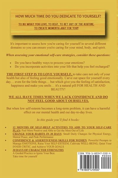 How Much Time Do You Dedicate to Yourself? To Do What You Love, To Rest, To Get Out of The Routine, To Create Moments Just for You? It's important to assess how you're caring for yourself in several different domains so you can ensure you're caring for your mind, body, and spirit. When assessing your emotional self-care strategies, consider these questions:Do you have healthy ways to process your emotions? Do you incorporate activities into your life that help you feel recharged? THE FIRST STEP IS TO LOVE YOURSELF, to take care not only of your health but also of feeling good emotionally. Carve out space for yourself every day... even for the little things... but which give you the feeling of satisfaction, happiness and make you smile... it's a natural pill FOR HEALTH AND BEAUTY! In an increasingly frenetic society that forces us to always be in a hurry, stress almost becomes a necessity. Yes, due to this hectic life, we often forget to take care of ourselves and, in the long run, we begin to feel the first signs, such as lack of concentration, tiredness, frustration, listlessness, and much more. This is why it is essential to undertake one's own path of personal growth that helps us to find the inner peace that this lifestyle has made us lose. WE ALL HAVE TIMES WHEN WE LACK CONFIDENCE AND DO NOT FEEL GOOD ABOUT OURSELVES. But when low self-esteem becomes a long-term problem, it can have a harmful effect on our mental health and our day-to-day lives. In this guide you'll find 4 books: · EMOTIONAL SELF CARE for Black Women - 12 MONTHS OF SELF-HELP ACTIVITIES TO ADD TO YOUR SELF-CARE PLAN: Feel More Positive and Able to Get the Most Out of Life · SELF-CARE WORKBOOK for Black Women - CHANGE YOUR HABITS IN 30 DAYS: Small Daily Changes for Physical Energy, Mental Peace, and Peak Performance · EMOTIONAL Self Care for Black Women - CONFIDENCE & ASSERTIVENESS SKILLS FOR WOMEN. Powerful Prompts to Manage EMOTIONS, Raise Your SELF-ESTEEM, Cultivate WELL-BEING, Quiet Your INNER CRITIC, and Achieve YOUR GOALS · Self-Care WORKBOOK for Black Women - 30 DAYS OF CHARACTER STRENGTHS - A Guided Practice to Ignite Your Best. Take time for yourself DECIDE TO START TODAY! Even when you feel like you don't have time to squeeze in one more thing, MAKE SELF-CARE A PRIORITY. When you're caring for all aspects of yourself, you'll find that you are able to operate more effectively and efficiently! If you're a woman who wears many hats - mom, wife, career, friend, sister, and more - this self-care activities book is for YOU.