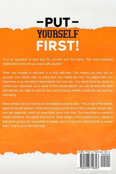 "It is so important to take time for yourself and find clarity. The most important relationship is the one you have with yourself." When you engage in self-care, it is truly self-care. This means you only rely on yourself, and nobody else, to make sure your needs are met. You realize that your happiness is no one else's responsibility but your own. You alone have the ability to control your outcomes. As a result of this independence, you will develop the skills and attitude you need to care for your own physical, mental, emotional, and spiritual well-being. Many people work so hard to try and please everyone else. This is one of the telltale signs of low self-esteem. While they're busy worried about other peoples' needs, their own get neglected, which will wear them down over time. The more they're unable to please someone, the harder they will try. What people in this situation don't realize is that some people are impossible to please, and it is not their responsibility to please them. That is up to the individual. In "PUT YOURSELF FIRST!" You Will Learn: ¿ What is low self-esteem, and how is it developed over time through many different factors. ¿ How low and high self-esteem affects our mindsets, thought processes, and overall lives. ¿ Specific action steps, strategies, and techniques to help improve our self-esteem by rewiring our brain and neural pathways. ¿ Surround Yourself With Healthy relationships ¿ Allow Time for Your Mind to Wander ¿ What self-confidence is and how does it differ from self-esteem. ¿ Specific strategies to help build our self-esteem in different areas of our lives. ¿ Why Self-Care Is the Best Care ¿ Understanding And Protecting Your Energy Field ¿ Cultivating Self-Trust in your Healing Journey ¿ The importance of self-care and how it is tied to self-esteem and self-confidence. ¿ Specific techniques to properly initiate self-care from many different aspects. ¿ Healing Through Trapped Emotion Release ¿ Mini Meditation Toolbox: 25 Quick and Easy Energy Restoration and Protection Meditation ¿ Practicing Self-Compassion At Work and In Relationships ¿ How To Treat Yourself As You Would a Close Friend ¿ Give Yourself Permission to Set Boundaries ¿ Eliminating Toxicity and Not Caring About Losing Friends ¿ Accept Your Own Difficulties and Weaknesses And so much more! Pick up your copy of the book right now by clicking the BUY NOW button at the top of this page!