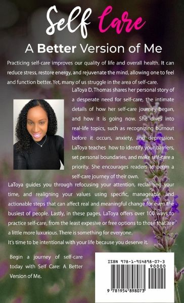 Practicing self-care improves our quality of life and overall health. In fact, it can reduce stress, restore energy, and rejuvenate the mind allowing a person to feel and function better, yet many of us struggle in the area of self-care. LaToya D. Thomas teaches us to recognize stress and burnout before they occur, how to identify your barriers, and how to break free from it all. She shares her personal stories of struggling to recognize the need for self-care and provides the blueprint on how to refocus your attention, reclaim your time, and become a happier and healthier person using quick and actionable steps that even the busiest of people can manage to do. Begin a journey of self-care today by intentionally caring for yourself with Self Care: A Better Version of Me.