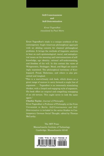 A unique synthesis of the contemporary, Anglo-American philosophical approach with an abiding concern for classical philosophical problems. This book seeks to clarify the precise structure of self-consciousness and self-determination and elucidates their significance for our philosophical understanding of self-knowledge and human agency.The analysis challenges traditional models of theoretical self-knowledge and practical self-relation and elaborates an account of rationally grounded responsibility that jointly fulfills the demands of autonomy and authenticity.Tugendhat's study is a unique synthesis of the contemporary Anglo-American philosophical approach with an abiding concern for classical philosophical problems. It brings the methods of linguistic analysis to bear on such epistemological, moral, and metaphysical issues as the meaning and interconnections of self-knowledge, ego identity, rational self-understanding, and freedom of the will. In this context, the views of Wittgenstein, Heidegger, Mead, and Hegel are searchingly examined. The philosophical testimony of Kierkegaard, Freud, Habermas, and others is also presented and weighed. Self-Consciousness and Self-Determination is based on a series of lectures given at Heidelberg. The book is included in the series Studies in Contemporary German Social Thought, edited by Thomas McCarthy.