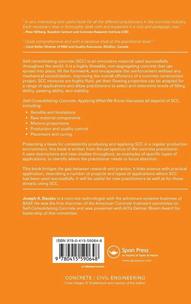"A very interesting and useful book for all the different practitioners in the concrete industry. Each necessary step is thoroughly dealt with and explained in a nice and pedagogic way." -Peter Billberg, Swedish Cement and Concrete Research Institute (CBI) "Quite comprehensive and with a narrative style at the practitioner level." -Lloyd Keller, Director of R&D and Quality Assurance, EllisDon, Canada Self-consolidating concrete (SCC) is an innovative material used successfully throughout the world. It is a highly flowable, non-segregating concrete that can spread into place, fill the formwork, and encapsulate the reinforcement without any mechanical consolidation, improving the overall efficiency of a concrete construction project. SCC mixtures are highly fluid, yet their flowing properties can be adapted for a range of applications and allow practitioners to select and determine levels of filling ability, passing ability, and stability. Self-Consolidating Concrete: Applying What We Know discusses all aspects of SCC, including: Benefits and limitations Raw material components Mixture proportions Production and quality control Placement and curing Presenting a basis for consistently producing and applying SCC in a regular production environment, this book is written from the perspective of the concrete practitioner. It uses descriptions and case studies throughout, as examples of specific types of applications, to identify where the practitioner needs to focus attention. This book bridges the gap between research and practice. It links science with practical application, describing a number of projects and types of applications where SCC has been used successfully. It will be useful for new practitioners as well as for those already using SCC.