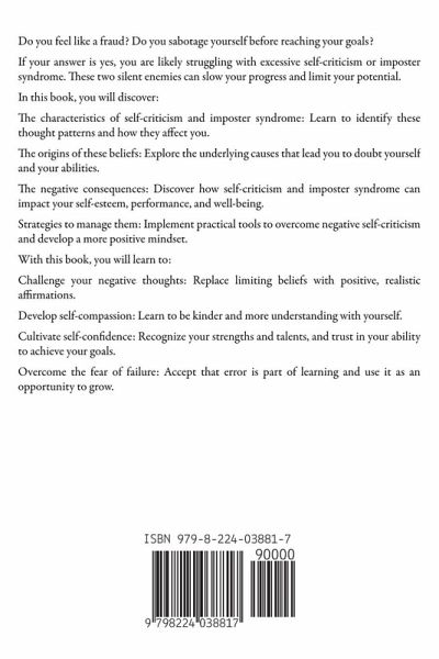 Do you feel like a fraud? Do you sabotage yourself before reaching your goals? If your answer is yes, you are likely struggling with excessive self-criticism or imposter syndrome. These two silent enemies can slow your progress and limit your potential. In this book, you will discover: The characteristics of self-criticism and imposter syndrome: Learn to identify these thought patterns and how they affect you. The origins of these beliefs: Explore the underlying causes that lead you to doubt yourself and your abilities. The negative consequences: Discover how self-criticism and imposter syndrome can impact your self-esteem, performance, and well-being. Strategies to manage them: Implement practical tools to overcome negative self-criticism and develop a more positive mindset. With this book, you will learn to: Challenge your negative thoughts: Replace limiting beliefs with positive, realistic affirmations. Develop self-compassion: Learn to be kinder and more understanding with yourself. Cultivate self-confidence: Recognize your strengths and talents, and trust in your ability to achieve your goals. Overcome the fear of failure: Accept that error is part of learning and use it as an opportunity to grow. This book is for you if: You are a self-critical person who constantly questions yourself. You feel like you're not good enough to succeed. You sabotage yourself before reaching your goals. You constantly compare yourself to others and feel inferior. You want to develop a more positive and confident mindset. "Self-Criticism and Imposter Syndrome" offers you a practical guide to overcome these obstacles and reach your full potential. No matter what stage of your life you are in, this book will give you the tools you need to build strong self-esteem and conquer your dreams.