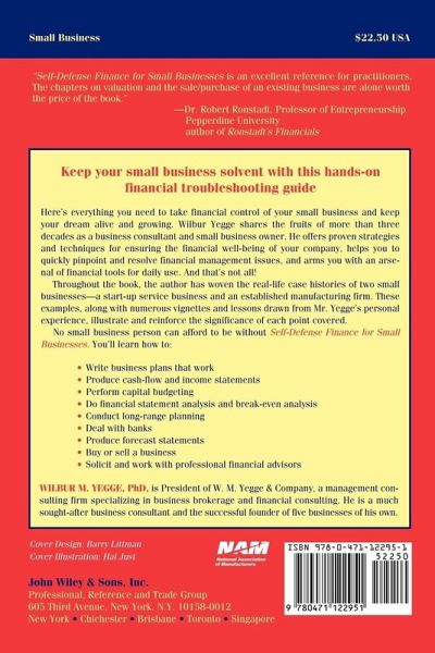 Small Business "Self-Defense Finance for Small Businesses is an excellent reference for practitioners. The chapters on valuation and the sale/purchase of an existing business are alone worth the price of the book."--Dr. Robert Ronstadt, Professor of Entrepreneurship Pepperdine University author of Ronstadt's Financials Keep your small business solvent with this hands-on financial troubleshooting guide Here's everything you need to take financial control of your small business and keep your dream alive and growing. Wilbur Yegge shares the fruits of more than three decades as a business consultant and small business owner. He offers proven strategies and techniques for ensuring the financial well-being of your company, helps you to quickly pinpoint and resolve financial management issues, and arms you with an arsenal of financial tools for daily use. And that's not all! Throughout the book, the author has woven the real-life case histories of two small businesses--a start-up service business and an established manufacturing firm. These examples, along with numerous vignettes and lessons drawn from Mr. Yegge's personal experience, illustrate and reinforce the significance of each point covered. No small business person can afford to be without Self-Defense Finance for Small Businesses. You'll learn how to: * Write business plans that work * Produce cash-flow and income statements * Perform capital budgeting * Do financial statement analysis and break-even analysis * Conduct long-range planning * Deal with banks * Produce forecast statements * Buy or sell a business * Solicit and work with professional financial advisors