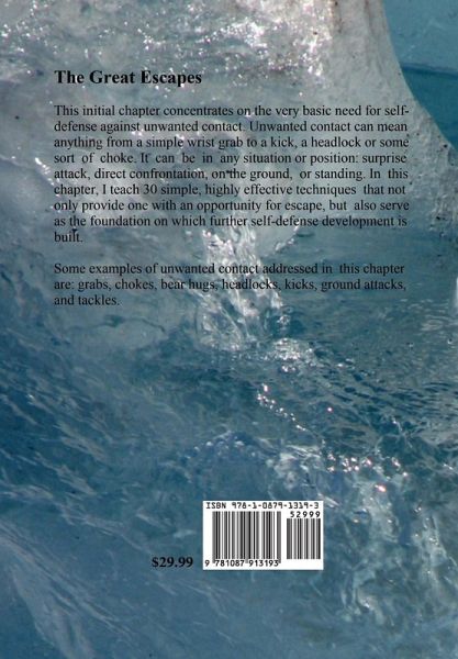 The Great Escapes This initial chapter concentrates on the very basic need for self-defense against unwanted contact. Unwanted contact can mean anything from a simple wrist grab to a kick, a headlock or some sort of choke. It can be in any situation or position: surprise attack, direct confrontation, on the ground, or standing. In this chapter, I teach 30 simple, highly effective techniques that not only provide one with an opportunity for escape, but also serve as the foundation on which further self-defense development is built. Some examples of unwanted contact addressed in this chapter are: grabs, chokes, bear hugs, headlocks, kicks, ground attacks, and tackles.