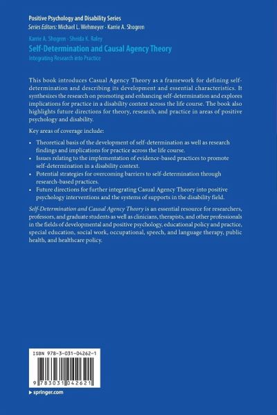 Key areas of coverage include: Theoretical basis of the development of self-determination as well as research findings and implications for practice across the life course. Issues relating to the implementation of evidence-based practices to promote self-determination in a disability context. Potential strategies for overcoming barriers to self-determination through research-based practices. Future directions for further integrating Casual Agency Theory into positive psychology interventions and the systems of supports in the disability field. Self-Determination and Causal Agency Theory is an essential resource for researchers, professors, and graduate students as well as clinicians, therapists, and other professionals in the fields of developmental and positive psychology, educational policy and practice, special education, social work, occupational, speech, and language therapy, public health, and healthcare policy.