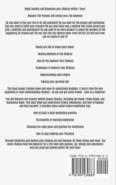 Begin healing and balancing your chakras within 1 hour! Discover the Passion and Energy your Life deserves Do you want to live your life to its full potential? Do you wish for the energy and motivation that you need to fulfill your dreams? Do you wish there was a method that could unlock your gifts, creativity and abundance? Do you want to be more present to enjoy the wonders of life happening all around you? Do you feel like you deserve more from life but are not sure how you are going to get it? Would you like to know more about: Healing Methods of The Chakras How Do You Balance Your Chakras Techniques to Balance Your Chakras Understanding each chakra Raising your spiritual self This book breaks training down into easy-to-understand modules. It starts from the very beginning of fully understanding chakras , so you can get great results - even as a beginner! You will discover the science behind chakra healing, including Ida Naadi, Pingla Naadi, and Sushumna Naadi. This book helps you understand chakra imbalances, and how to balance and heal yourself. It provides many useful chakra meditation tips: How to build a daily meditation practice The benefits of morning meditation Choosing the right place and position for meditation How to stop fighting your thoughts Through balancing and healing your chakras you will discover all these things and more. The seven chakras hold the blueprint for a life lived with passion, joy, energy and abundance and you could get started within the next hour! Grab your copy today,/b>