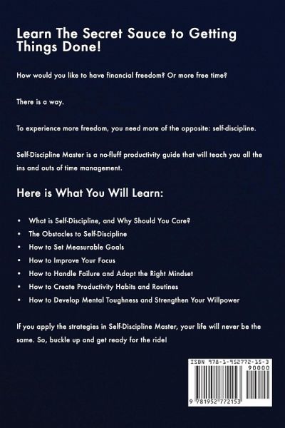 Learn How to Increase Your Self-Discipline & Boost Your Productivity! How would you like to have financial freedom? Are you feeling stuck, wishing you'd have more free time? There is a way. But you may be surprised to learn how you can experience more freedom... Get Your Copy of: 'Self-Discipline Master' To experience more freedom in your life, you need more of the opposite: self-discipline. Does that sound paradoxical? Allow me to explain. If you want: - more free time: you will need to get better at time management. - financial freedom: you need financial discipline. - be in great shape: you need to eat healthy and exercise regularly. By being disciplined, you can create the life you always wanted! 'Self-Discipline Master' is a no-fluff productivity guide that will teach you all the ins and outs of time management. We'll not only cover tactics to resist temptations and beat procrastination. But also strategies to get more focused, become more productive, and manage your time better. If you were to ask successful people how they climbed the mountain, they will tell you that it comes down to two things. Grit and, what Cal Newport calls, 'Deep Work'. You will learn how to do both with 'Self-Discipline Master'! Why You Should Check Out 'Self-Discipline Master' This book is jam-packed with invaluable tips from a productivity expert. What's most important: I will take you by the hand and show you easy, practical step-by-step instructions to simply get stuff done. If I can do it, so can you! Here is What You Will Learn: - What is Self-Discipline, and Why Should You Care? - The Obstacles to Self-Discipline - How to Set Measurable Goals - Why You Should Hold Yourself Accountable if You Want to Achieve Your Goals - How to Improve Your Focus - How to Handle Failure and Adopt the Right Mindset - How to Create Productivity Habits and Routines That Will Boost Your Performance - How to Develop Mental Toughness and Strengthen Your Willpower - And Much More! And Here's The Cool Thing: at the end of every chapter, you will find Action Steps. These allow you to (1) reflect on what you learned, and (2) encourage you to take action. Finally, as a FREE & EXCLUSIVE BONUS, you'll also get the chapter 'Six Simple Ways to Improve Your Focus NOW' from my other popular book 'Super Focus'. To recap: If you apply what you will learn in 'Self-Discipline Master', you will be able to achieve anything you set your mind to. So, let's get started, shall we? Take action now! Scroll to the top of this page and click the 'Buy Now' button.