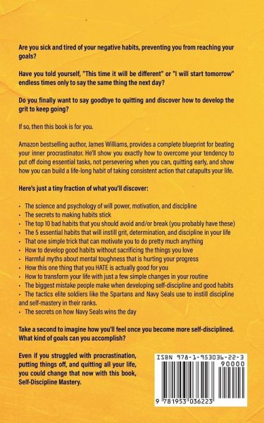 If you've always wanted to be more self-disciplined but can't seem to stop procrastinating, quitting, and get rid of bad habits, then keep reading... Are you sick and tired of your negative habits, preventing you from reaching your goals? Have you told yourself, "This time it will be different" or "I will start tomorrow" endless times only to say the same thing the next day? Do you finally want to say goodbye to quitting and discover how to develop the grit to keep going? If so, then you've come to the right place. You see, being more self-disciplined doesn't have to be complicated. Even if you've tried other solutions that didn't work. In fact, it's easier than you think. Amazon bestselling author, James Williams, provides a complete blueprint for beating your inner procrastinator. He'll show you exactly how to overcome your tendency to put off doing essential tasks, not persevering when you can, quitting early, and show how you can build a life-long habit of taking consistent action that catapults your life. Here's just a tiny fraction of what you'll discover: The science and psychology of will power, motivation, and discipline The secrets to making habits stick The top 10 bad habits that you should avoid and/or break (you probably have these) The 5 essential habits that will instill grit, determination, and discipline in your life That one simple trick that can motivate you to do pretty much anything How to develop good habits without sacrificing the things you love Harmful myths about mental toughness that is hurting your progress How this one thing that you HATE is actually good for you How to transform your life with just a few simple changes in your routine The biggest mistake people make when developing self-discipline and good habits The tactics elite soldiers like the Spartans and Navy Seals use to instill discipline and self-mastery in their ranks. The secrets on how Navy Seals wins the day ...and much, much more! Take a second to imagine how you'll feel once you become more self-disciplined. What kind of goals can you accomplish? Even if you struggled with procrastination, putting things off, and quitting all your life, you could change that now with this book, Self-Discipline Mastery. So if you have a burning desire for self-mastery and transforming your life, then scroll up and click "Add to Cart" now!