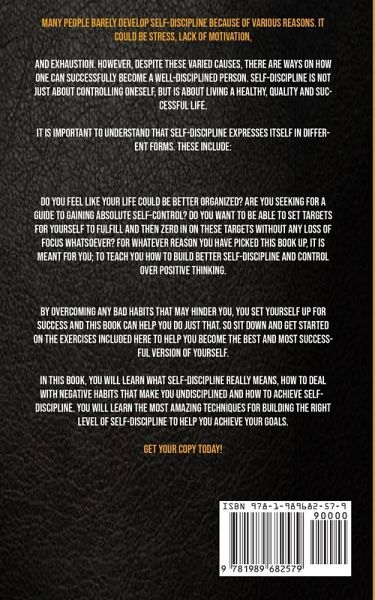 Many people barely develop self-discipline because of various reasons. It could be stress, lack of motivation, and exhaustion. However, despite these varied causes, there are ways on how one can successfully become a well-disciplined person. Self-discipline is not just about controlling oneself, but is about living a healthy, quality and successful life. It is important to understand that self-discipline expresses itself in different forms. These include: The ability to persevere through hardships The strength to continue even in the face of setbacks and failures The wisdom to avoid distractions and procrastination The power to resist temptation The zeal to overcome bad habits The motivation to fulfill your objectives The will to try again and again until you accomplish your goal Do you feel like your life could be better organized? Are you seeking for a guide to gaining absolute self-control? Do you want to be able to set targets for yourself to fulfill and then zero in on these targets without any loss of focus whatsoever? For whatever reason you have picked this book up, it is meant for you; to teach you how to build better self-discipline and control over positive thinking. By overcoming any bad habits that may hinder you, you set yourself up for success and this book can help you do just that. So sit down and get started on the exercises included here to help you become the best and most successful version of yourself. In this book, you will learn what self-discipline really means, how to deal with negative habits that make you undisciplined and how to achieve self-discipline. You will learn the most amazing techniques for building the right level of self-discipline to help you achieve your goals. Download your copy today!