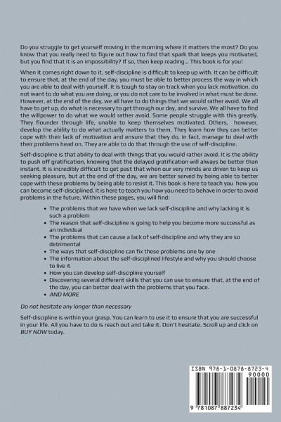 Do you struggle to get yourself moving in the morning where it matters the most? Do you know that you really need to figure out how to find that spark that keeps you motivated, but you find that it is an impossibility? If so, then keep reading... This book is for you! When it comes right down to it, self-discipline is difficult to keep up with. It can be difficult to ensure that, at the end of the day, you must be able to better process the way in which you are able to deal with yourself. It is tough to stay on track when you lack motivation, do not want to do what you are doing, or you do not care to be involved in what must be done. However, at the end of the day, we all have to do things that we would rather avoid. We all have to get up, do what is necessary to get through our day, and survive. We all have to find the willpower to do what we would rather avoid. Some people struggle with this greatly. They flounder through life, unable to keep themselves motivated. Others, however, develop the ability to do what actually matters to them. They learn how they can better cope with their lack of motivation and ensure that they do, in fact, manage to deal with their problems head on. They are able to do that through the use of self-discipline. Self-discipline is that ability to deal with things that you would rather avoid. It is the ability to push off gratification, knowing that the delayed gratification will always be better than instant. It is incredibly difficult to get past that when our very minds are driven to keep us seeking pleasure, but at the end of the day, we are better served by being able to better cope with these problems by being able to resist it. This book is here to teach you how you can become self-disciplined. It is here to teach you how you need to behave in order to avoid problems in the future. Within these pages, you will find: